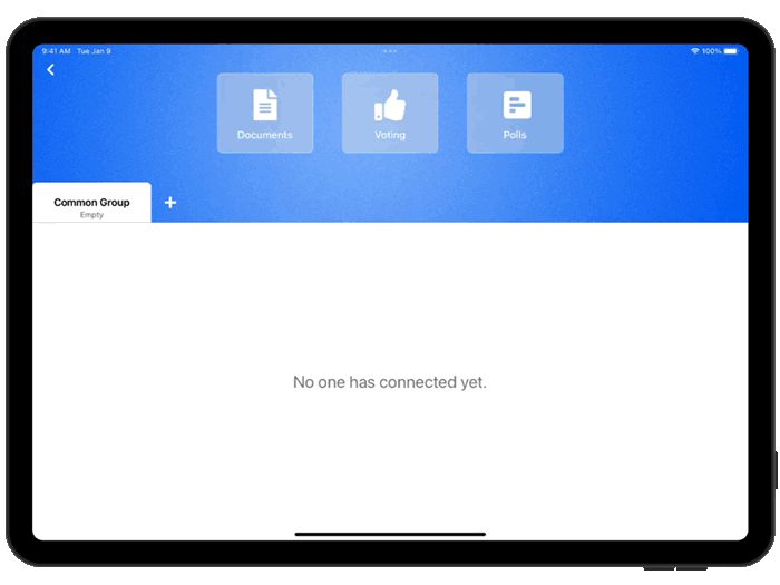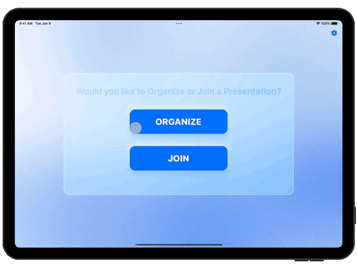 When you open Presentation Room on the device designated as the Organizer, your initial step is to tap the **Organize** button. Doing so connects your device to the server, automatically creating what we call a *Common Group*. This group serves as the central hub for your meeting, allowing Participants to easily connect and engage without the need for manual setup or invite codes.